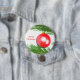 A pinback button with my red and green design of the close-up of a big red Christmas ball hanging on a Christmas tree branch. Text says "Merry Christmas".