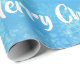 Modern Christmas giftwrap with the words "Merry Christmas" in stylish typography, snowflakes, an illustration of a unicorn (with a mane and tail with red and golden glitter) pulling Santa in his sleigh, and a Xmas tree. On a blue background with snowflakes. Note that you can personalize the smaller greeting with the name of a kid.