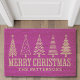 Merry Christmas Trees Typography Personalized Name Holiday Coir Doormat features the text "Merry Christmas" in modern typography accented Christmas trees and personalized with your custom name on a pink background. Perfect for Christmas decor. Created by Evco Studio www.zazzle.com/store/evcostudio