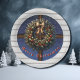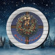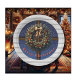 These paper plates have a unique design of a beautiful Christmas wreath with bells hanger on a window seal. There is a snow falling in the background,