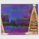 Merry Christmas stylish green typography with bright, outside Christmas tree and beautiful night background, with various trees, deep blue sky and purple lighting repeating pattern design for your festive cheer.