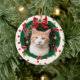Festive custom pet Christmas ornament featuring a green and red wreath on a holly leaf and berry background. Replace the cat picture in the wreath with a photo of your cat or dog. It would also work great with a picture of your child or a family photo.
