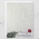 "Merry Christmas" written in the snow with a decorative red Christmas tree ball and a snowy fir branch.