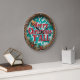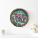 This festive clock features the bold, red typography "Merry Christmas Y'ALL" over a turquoise background with a white, stylized cow print overlay. A cowboy hat sits above the text, and the face is encircled by a rustic braided rope border decorated with holly and red berries. This design perfectly blends Southern country charm with the holiday spirit. The design may look real due to the high detail and three-dimensional texture in the artwork.