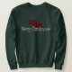 This festive and fun sweat shirt designed for the holidays has a red and black Buffalo plaid pattern on a moose with wording across the chest that says: "Merry Christmoose" on it.