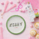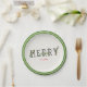 Pretty holiday paper plates have a white linen look textured background and a striped green and white edge. An open faced black type spells out "MERRY" in large capital letters and has dainty Christmas greens and holly berries intertwined throughout. Below that "Everything" is written in a delicate fancy red script. Also available with a red and white striped border.
