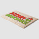 This rectangular coir doormat features the text "MERRY" in bold red letters stacked above "GRINCHMAS!" in bold green letters with a black outline. To the right, there is a cartoon illustration of the Grinch's green face wearing a red Santa hat with white trim. The doormat is placed on a tiled floor in front of a wooden door. This festive doormat combines the traditional Christmas greeting with the iconic Grinch character.