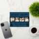 Create your own luxe real rose gold foil holiday greeting postcards with this simple yet elegant four photo design in dark blue and rose gold with a stylized tree for Christmas and a minimalist Menorah for Hanukkah. Merry Happy Chrismukkah! Add your four favorite photos using the simple template uploader and watch your pictures appear with rounded corners framed in deep blue on a broad rose gold foil strip. MERRY HAPPY at the top of these holiday postcards in a bold yet whimsical font is balanced by CHRISMUKKAH in a slightly different stylized font and flanked by the Christmas tree and Menorah, all printed in elegant rose gold foil on the deep blue background. Each personalized postcard reverses to reveal a dark blue border, an option for you to add your return address in the upper left and a template to add a custom holiday greeting in the middle. Created with you in mind, celebrating Christmas and Hanukkah together in an interfaith family, these dark blue and real rose gold foil CHRISMUKKAH photo postcards are a creative and casual way to spread holiday cheer this year.