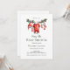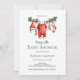This adorable Merry Little Baby Shower Invitation features a clothesline with Santa-inspired baby clothes with Santa Hat, red and white body suit, socks, and a Christmas stocking.
