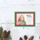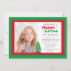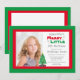 Kids Christmas themed merry little birthday invitations. Invite features red and green holiday theme with gray snowflakes, Christmas tree and presents. Template photo via Pixabay licensed under CC0 and must be replaced with your own photo