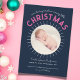 Announce your little one's arrival in style with our Christmas Birth Announcement, a perfect blend of joy and festivity. This versatile card doubles as your holiday greeting, featuring a rich navy blue backdrop adorned with vibrant festive lettering that reads 'We're having ourselves a merry little Christmas.' The front showcases a bold circle photo template, allowing you to feature your favorite snapshot of your new bundle of joy. On the back, three elegant arch-shaped templates await your family photos, ensuring your loved ones can witness the complete picture of your growing family. With this announcement, you can share the warmth of the season and the joy of your new arrival, all in one delightful package. Celebrate this special moment and spread the holiday cheer with your nearest and dearest.