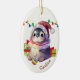 On the front of this keepsake ceramic ornament for a child is an adorable baby penguin wearing a Santa hat and a winter scarf. The penguin has a Christmas tree bulb between its feet, and gift packages beside it. There's a string of Holiday lights behind it. Your child's name is in red at the lower right. The back of the ornament has a Merry Christmas message and your signature. Perfect for a daughter, son, granddaughter or grandson.