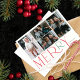 These simple holiday photo greeting cards feature the greeting, “Merry,” in large red and green letters on an ivory background with placeholders to add four of your favorite photos, family name & the year.