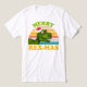 Merry Rex-mas Christmas Dinosaur Cute Dino Mens T-shirt features a retro styled sunset with a T-rex wearing a Santa hat and the text "Merry Rex-Mas" in modern typography. Designed by Evco Holidays www.zazzle.com/store/evcoholidays