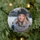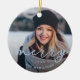 Simple and elegant holiday ornament features a photo on each side with "merry" overlaid in wintry ice blue script lettering. Personalize with the year beneath.