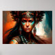 Watercolor and oil painting portrait of a beautiful young woman wearing a headdress and garments suggestive of a new world Mesoamerican warrior princess.