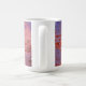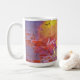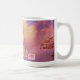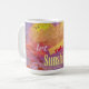The wall, in the original artwork by ZoeSPEAK on this inspirational Mug, is an old red brick wall with a mural on stucco which is crumbling away. The mural is a picture of puffy clouds in the sunset, all pink and bright yellow at the top against a deep blue sky. The message is to let the sunshine in.