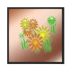 Flowers in orange, yellow and green, with green grass. Flowers are rendered in a three dimensional jell look, and are placed on a simulated copper background with angled lighting effects. Thin black edge creates a finishing frame.