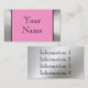 A metallic look frame border in smooth silver stainless steel look chrome on the front of the card with a light pink background gives a bold, unique 3d look professional-looking business card. Easily customize with your own information. Use the dynamic black stylish font shown or easily change the font style and color. Also you can easily change the pink color background to any color. Just click on "Customize it" and then click on "edit" and then "background" to change it. A unique and smart looking card, especially great for industrial, designers, artists, retail, etc. More information can be put on the back as well on the smooth metal look background. Design is printed on paper, not actual metal. A strong business card that stands out from the rest.