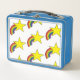 Whether you use it to bring your lunch or tote your lipstick , you'll love this retro style metal lunchbox with artwork by Buttercup's Clothing and Collectables! This super cute lunch box features pattern of multiple colorful rainbows emerging from bright yellow stars on the front side. Back side features one large star and rainbow. Various background colors available.