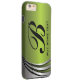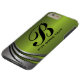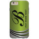 Metal silver grey stainless steel look-not real just a printed image- and lime green monogram iPhone 6 plus case template. A modern monogrammed design, featuring shiny metal silver grey curves with black outline and your monogram/initial on glowing green background. Click on “Customize it” to have a better result and choose color, and place for your initial.