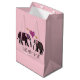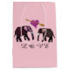Graphic illustration of metallic elephant and hearts design. Brighten up any special occasion with this fun, animal art. You can choose your favorite background color. These gift bags are made with premium quality paper and printed with vivid ink to make gift giving truly special. Available in four sizes and your choice of matte or glossy finish.