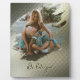 Photo plaque with a stand, with a textured brass design. Add your photo to the brushstroke template, with the metallic design frame. Use the design tool to help center the picture as needed. Sample wording, in black script beneath the photo, is "We love you", and is easy to customize.