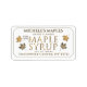 This maple syrup label can be customized with your business name, address and maple syrup volume in ounces and milliliters. There is a handy list of common container sizes with their conversions in the form field where you fill in your information. White background with gold text and border. For a special touch, the word “maple syrup” has a gold gradient. Four dainty gold and yellowish-orange leaves are scattered on the black background as though they were falling from a sugar maple in autumn.