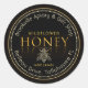 Black Label with the word HONEY written & reflected in metallic gold on black background with double gold and dotted border. Vintage bee outline illustration. Pre-calculated list of honey net weight conversions. Editable text in a curved border for Apiary or Beekeeper's name, and business location.