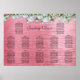 A gorgeous pink wedding guest seating chart featuring a metallic pattern similar to sheet metal, with a very traditional bridal touch of white roses along the top edge.
