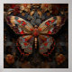 This artwork captures a magnificent butterfly, its wings adorned with intricate designs that echo the elegance of stained glass. The creature is surrounded by blossoming flowers, each petal and leaf meticulously crafted to radiate a metallic sheen. The dark backdrop accentuates the vibrant hues, creating a mesmerizing contrast that beckons the viewer into a world where nature and artistry converge.