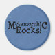Metamorphic Rocks! A simple geology pun catchphrase on a blue rock hammer background. Stick it on the fridge!