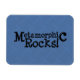 Metamorphic Rocks! A simple geology pun catchphrase on a blue rock hammer background. Stick it on the fridge!