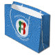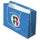 Large gift bag features our angel wearing the flag of Mexico for holiday gift decorating or Hanukkah decor. The Mexican Flag angel is found inside a white circular fractal of squiggly squares. The background is a blue fractal of squiggly squares. Add your own text or personalize with a name and the year.