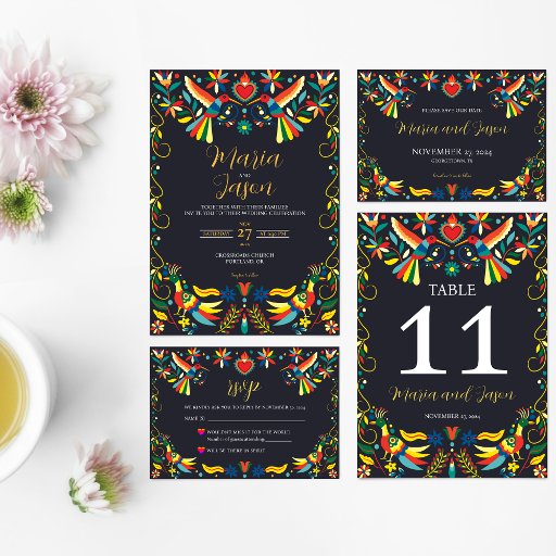 This Mexican Colorful Cinco de Mayo Fiesta Wedding Table Number design showcases a vibrant Mexican folk art-inspired theme, featuring colorful birds, flowers, and a central heart motif. The bright red, yellow, blue, and green hues stand out against the deep black background, creating a festive and lively atmosphere. The symmetrical arrangement of the birds and flowers adds balance and harmony, perfect for wedding invitations or celebratory stationery.