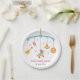 Mexican fiesta themed baby shower supplies paper plates for a colorful celebration. It features a cute interpretation of crib toys with familiar Mexican elements such as a cute pinata donkey, a guitar, a maraca shaker, a sombrero hat and a cute sun with lots of music notes. A cheerful and bright design! Color palette of blue, yellow, orange and pink. Personalize easily with your message in the text templates provided.