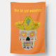This awesome house flag features a graphic design image of a Mexican Day of the Dead (Dia de los Muertos) inspired skull. The skull is a pale gray color and is wearing a yellow sombrero. It has gold teeth and Mexican Sunflowers, also called Tithonias< instead of eyes. The sombrero has a cactus on it and is covered in pretty swirl patterns and red and green Chilli peppers. The skull itself is covered in pretty colored flowers of different types.