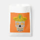 This awesome pack of 50 favor bags features a graphic design image of a Mexican Day of the Dead (Dia de los Muertos) inspired skull. The skull is a pale gray color and is wearing a yellow sombrero. It has gold teeth and Mexican Sunflowers, also called Tithonias< instead of eyes. The sombrero has a cactus on it and is covered in pretty swirl patterns and red and green Chilli peppers. The skull itself is covered in pretty colored flowers of different types.