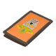 This awesome wallet features a graphic design image of a Mexican Day of the Dead (Dia de los Muertos) inspired skull. The skull is a pale gray color and is wearing a yellow sombrero. It has gold teeth and Mexican Sunflowers, also called Tithonias< instead of eyes. The sombrero has a cactus on it and is covered in pretty swirl patterns and red and green Chilli peppers. The skull itself is covered in pretty colored flowers of different types.