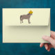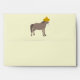This envelope features a pale brown donkey with a dark brown mane and tail. The Donkey is ready to celebrate the Day of the Dead, Dia de los Muertos. The Donkey is wearing a sombrero covered in red and green stars, carrots, colorful swirls, cherries and red and green chillies. There is a flower with orange petals and a yellow centre in the middle of the hat, called a Tithonia, or Mexican sunflower.