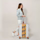 This awesome suitcase features a pale brown donkey with a dark brown mane and tail. The Donkey is ready to celebrate the Day of the Dead, Dia de los Muertos. The Donkey is wearing a sombrero covered in red and green stars, carrots, colorful swirls, cherries and red and green chillies. There is a flower with orange petals and a yellow centre in the middle of the hat, called a Tithonia, or Mexican sunflower.