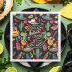 Spice up your celebration with this bold and colorful custom paper napkin, to add to your decor at any fiesta-style event! The vibrant design features a lively mix of Mexican icons—sombreros, cacti, chili peppers, maracas, and more—all set against a striking black background. A round label lets you personalize the message with a thank you note, guest name, event and event date, or custom text for birthdays, summer parties, or any festive occasion. A fun and unique way to say welcome! Search ID1114 with other products in this design set. Note: design adapted from generative content.