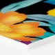 Design features a printed colored floral element in shades of orange, teal, pink, green, purple and green watercolor flowers on a black background with papel picado banner, cactus and a guitar. Calligraphy or type writing. Mix and match collection piece. Great for your wedding celebrations!