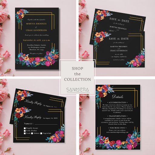 We love bright colors and bold designs, so we wanted something that would be fun and whimsical but still classy enough for a wedding. This design has an abundance of colorful flowers and modern typography on a black background for a sophisticated floral look that would fit all year round weddings.