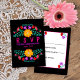 Colorful Mexican Fiesta Flowers on a black background. Suitable for any Mexican Fiesta themed party, this cheerful design features Floral Folk Art Flowers in Pink Red Purple and Yellow. The wording reads RSVP Please respond by [date] and the template is set up ready for you to add your own date. The back of the card has a white panel for your guests to add their name and indicate whether or not they are able to attend. For matching Quinceanera Invitations please browse our collection.
