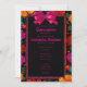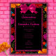 Set against a striking black background, the design bursts to life with a cascade of colorful fiesta flowers in brilliant magenta, yellow, and red hues. These rich colors are not only visually stunning—they hold cultural significance, echoing the passion, warmth, and joy of Mexican heritage. Delicately illustrated Mexican folk art flowers dance alongside ranchera-inspired flowers, instantly transporting guests to a festive hacienda filled with music, tradition, and love.