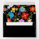 Bright and colorful Mexican Folk Art floral on the inside of the envelope. Black on the outside with address box areas in white with red trim.