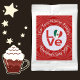 Personalized hot chocolate drink mix for a party favor featuring the green, white, and red Flag of Mexico in a heart shape makes the O in the red lettered word LOVE. Below it reads VALENTINE'S DAY 20??. You can customize it to say anything you like. Perhaps, CINCO DE MAYO 2024 or CHRISTMAS 2025? Above, a spot for your family name or any name you wish for added personalization. The word LOVE sits in the center of a digital art created white, fractal circle of squiggly squares. The whole design has a red background of squiggly squares. Can be lovely for a Mexican family reunion or a Christmas stocking stuffer. Fun for family reunions, too.