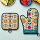 Add a splash of color to your kitchen with our Mexican Tile Pattern Oven Mitt and Pot Holder Set! Featuring a vibrant and intricate design inspired by traditional Mexican tiles, this set brings festive flair to your culinary adventures. The oven mitt is customizable, allowing you to add a personal touch with your name. Elevate your kitchen decor and make cooking more fun with this beautiful, personalized set!"