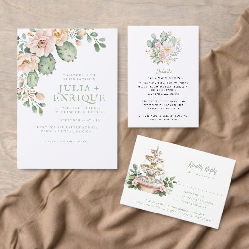 This beautiful Mexican building themed Details enclosure card features watercolor cactus design perfect for your Mexican destination wedding. Colors used include, olive green, pink, brown and white.